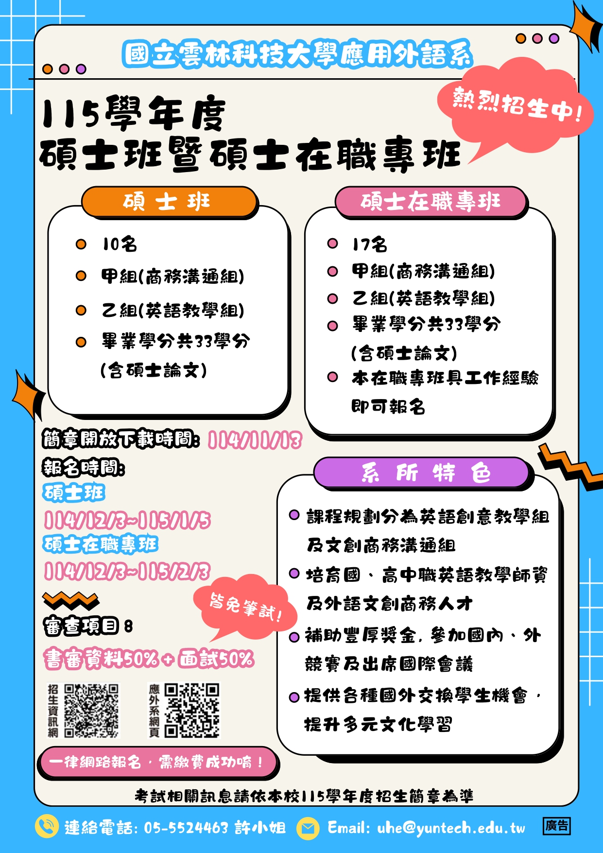 轉知:國立雲林科技大學應用外語系115學年度碩士班暨在職專班招生資訊