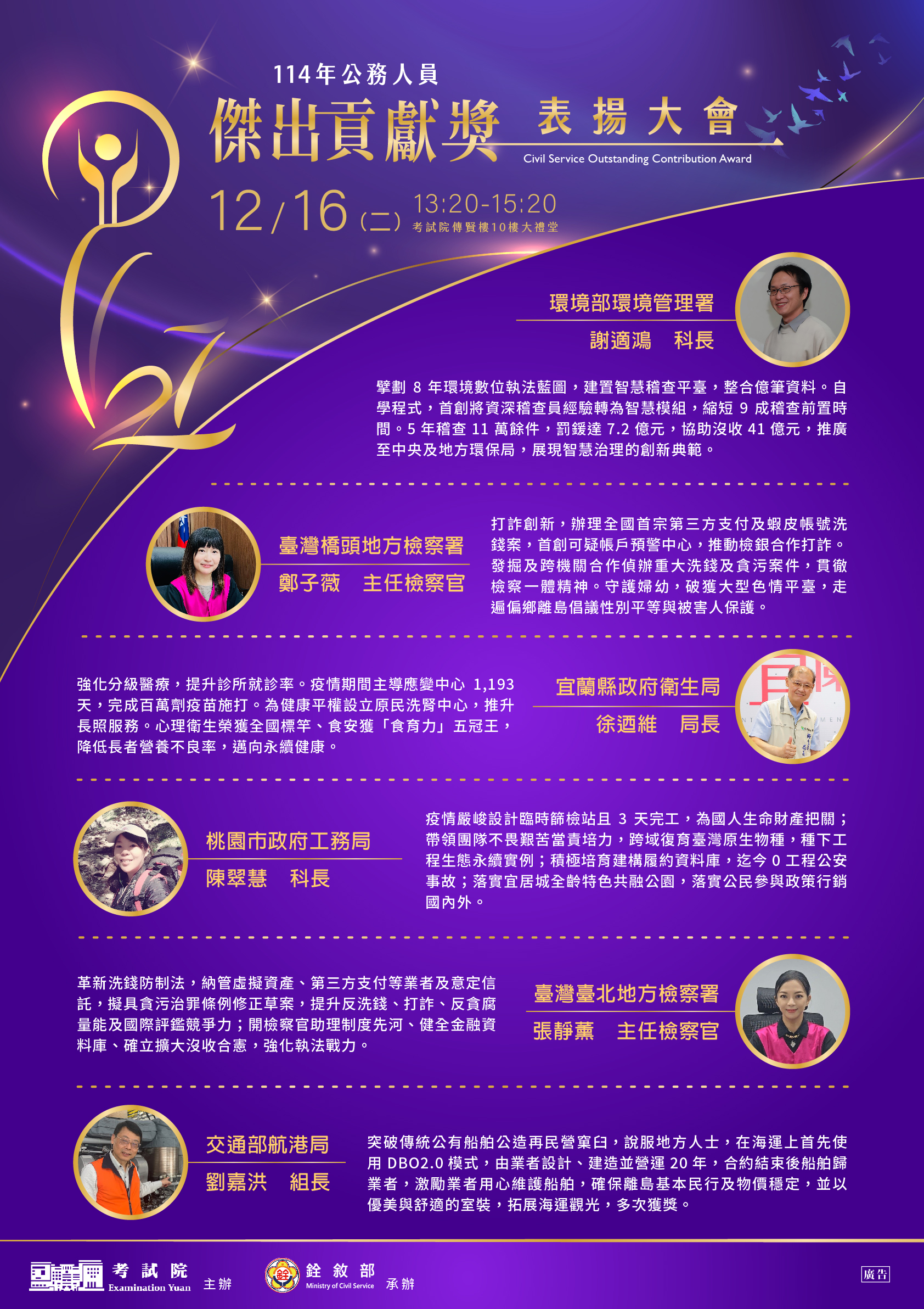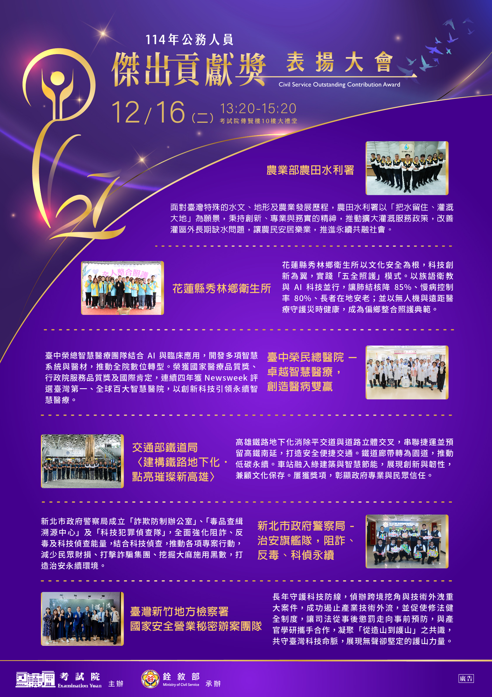 轉知:銓敘部「114年公務人員傑出貢獻獎表揚大會」電子海報
