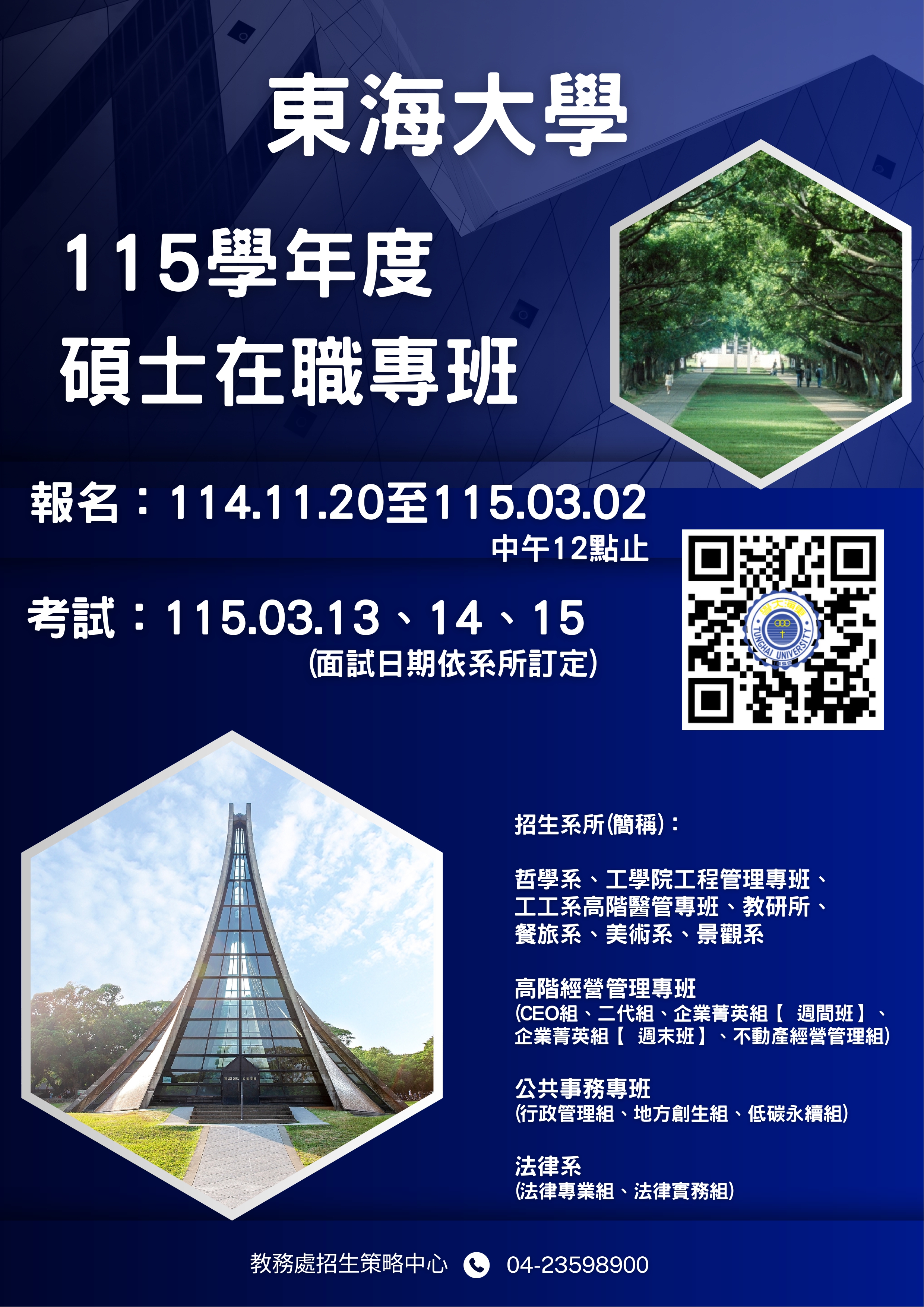 轉知:東海大學115學年度碩士在職專班招生簡章資訊