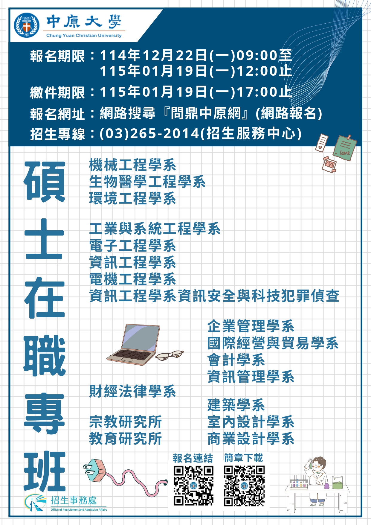 轉知:中原大學115學年度碩士在職專班入學考試招生簡章資訊